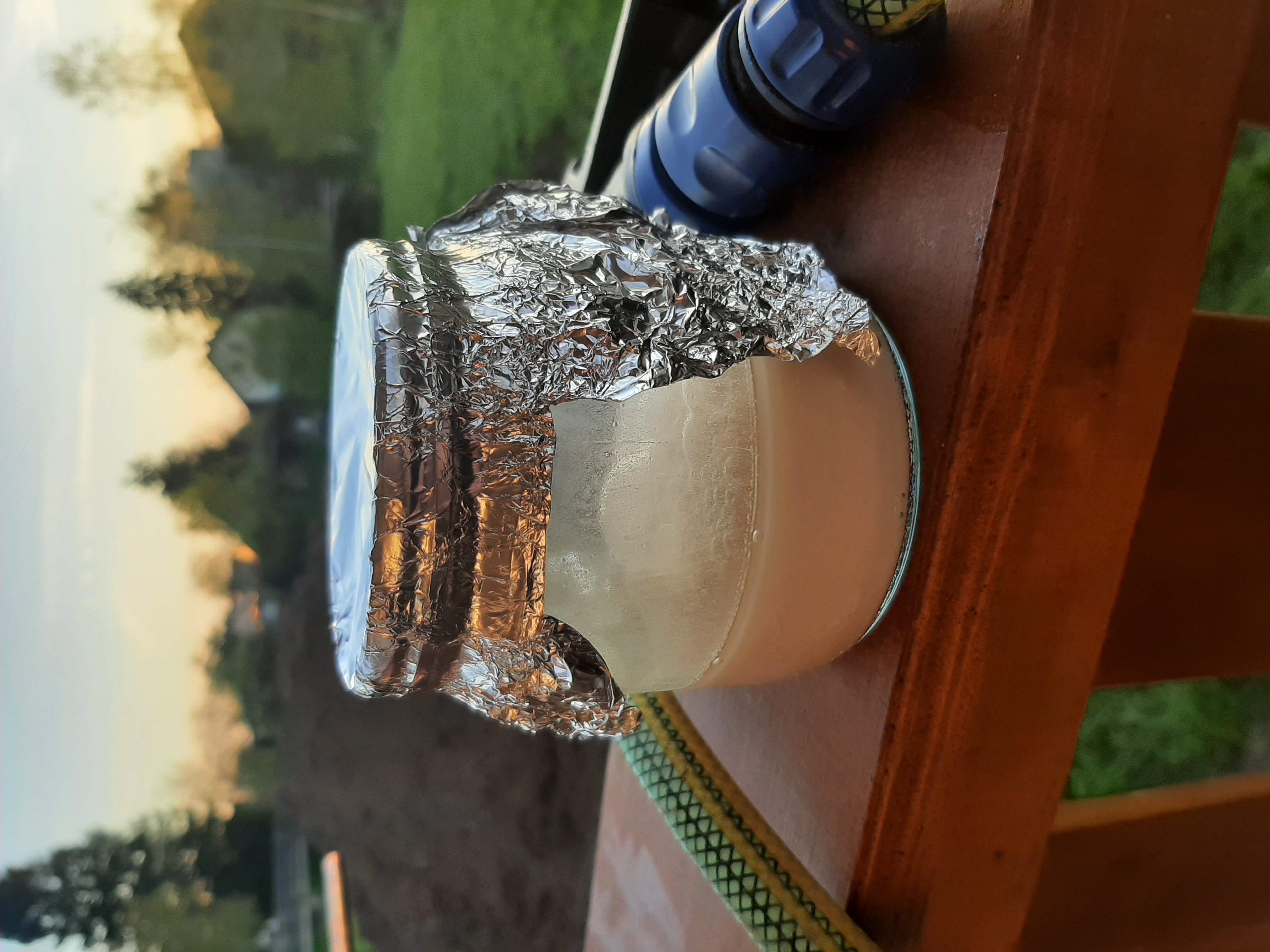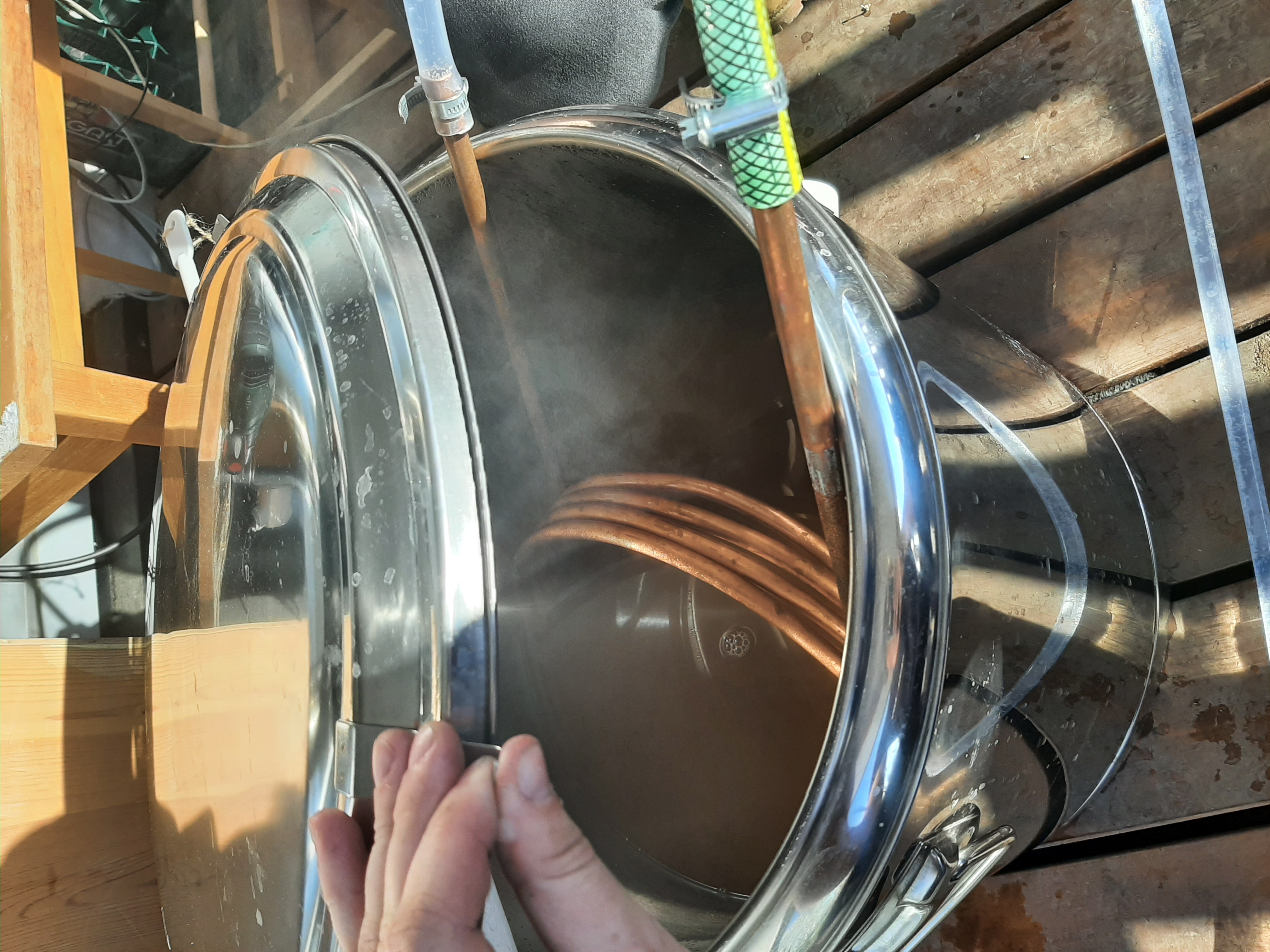 After all that chaos, things went better. Mashing was done and lautering was so fast that we had to choke the tubing to slow the flow rate. Then boiling and cooling with the copper coil. Wort was transferred into a plastic container with the yeast.