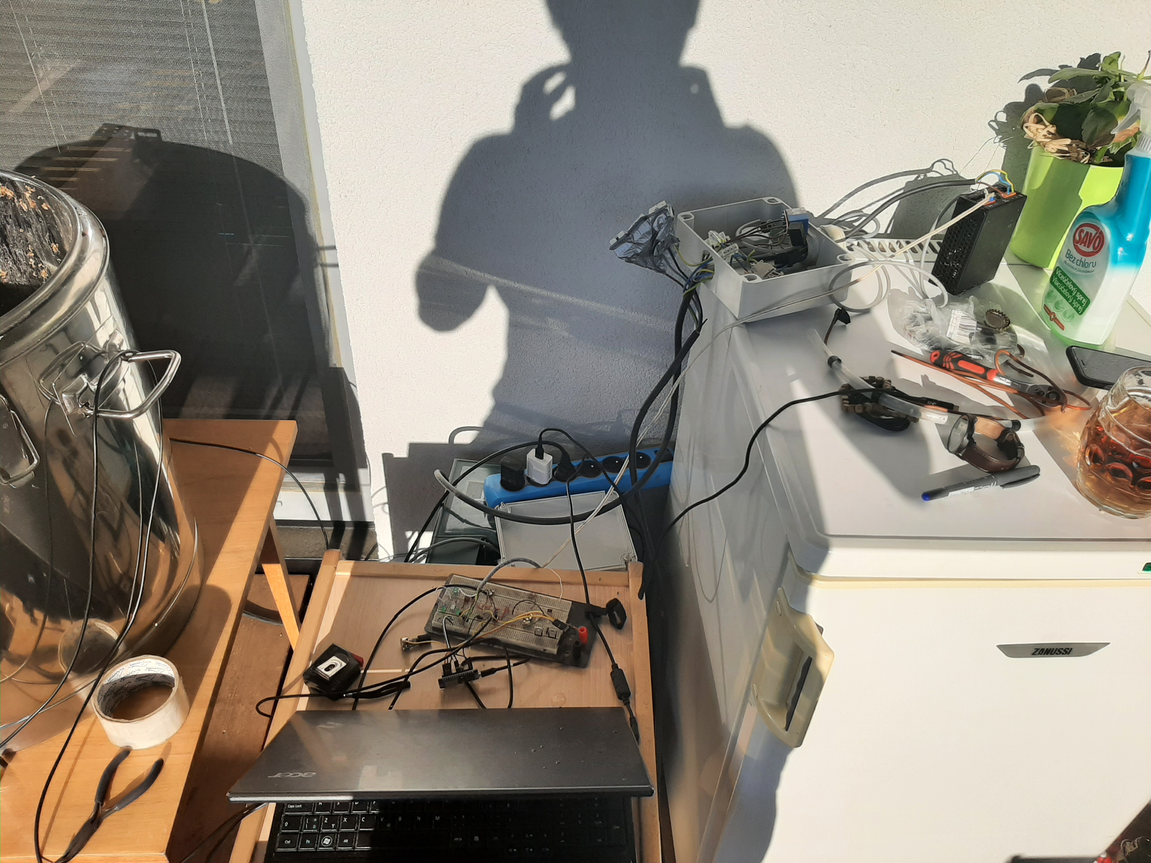 I started to heat up the water. Regulation was done by a quick-and-dirty PI regulator written in ESP8266 (NodeMCU). The temperature sensor cable snapped – a broken wire discovered during the process. A temporary workaround was improvised.