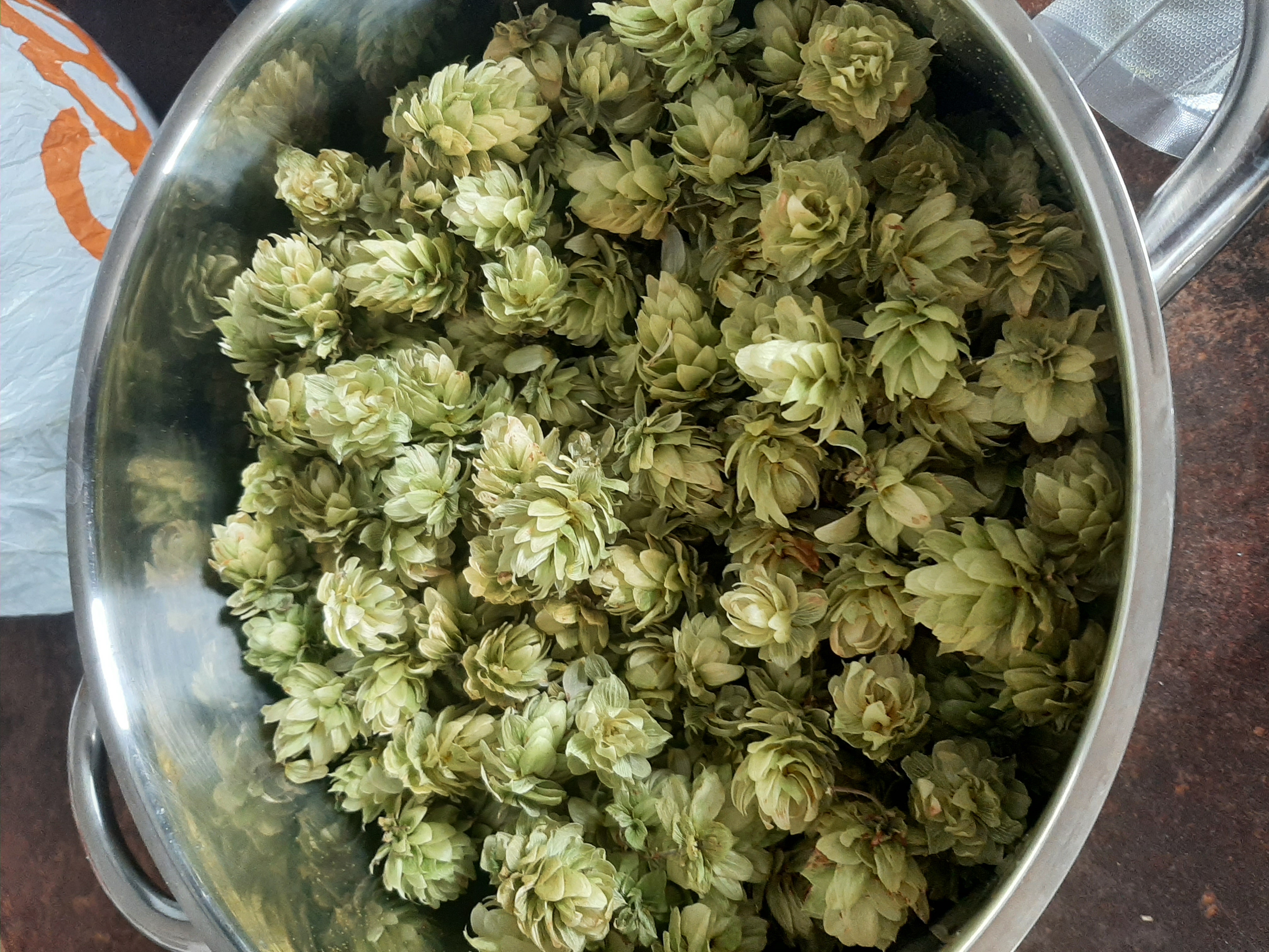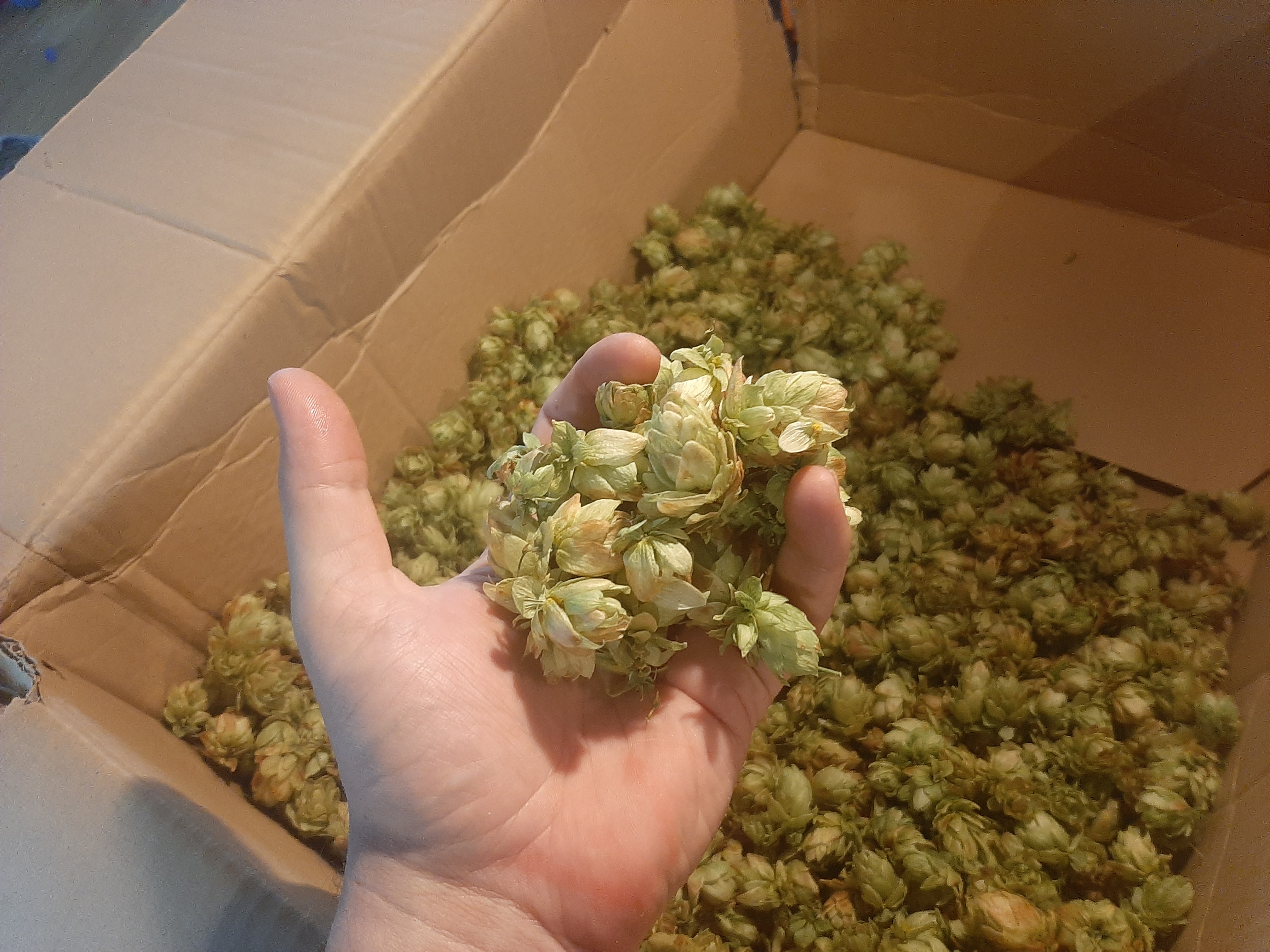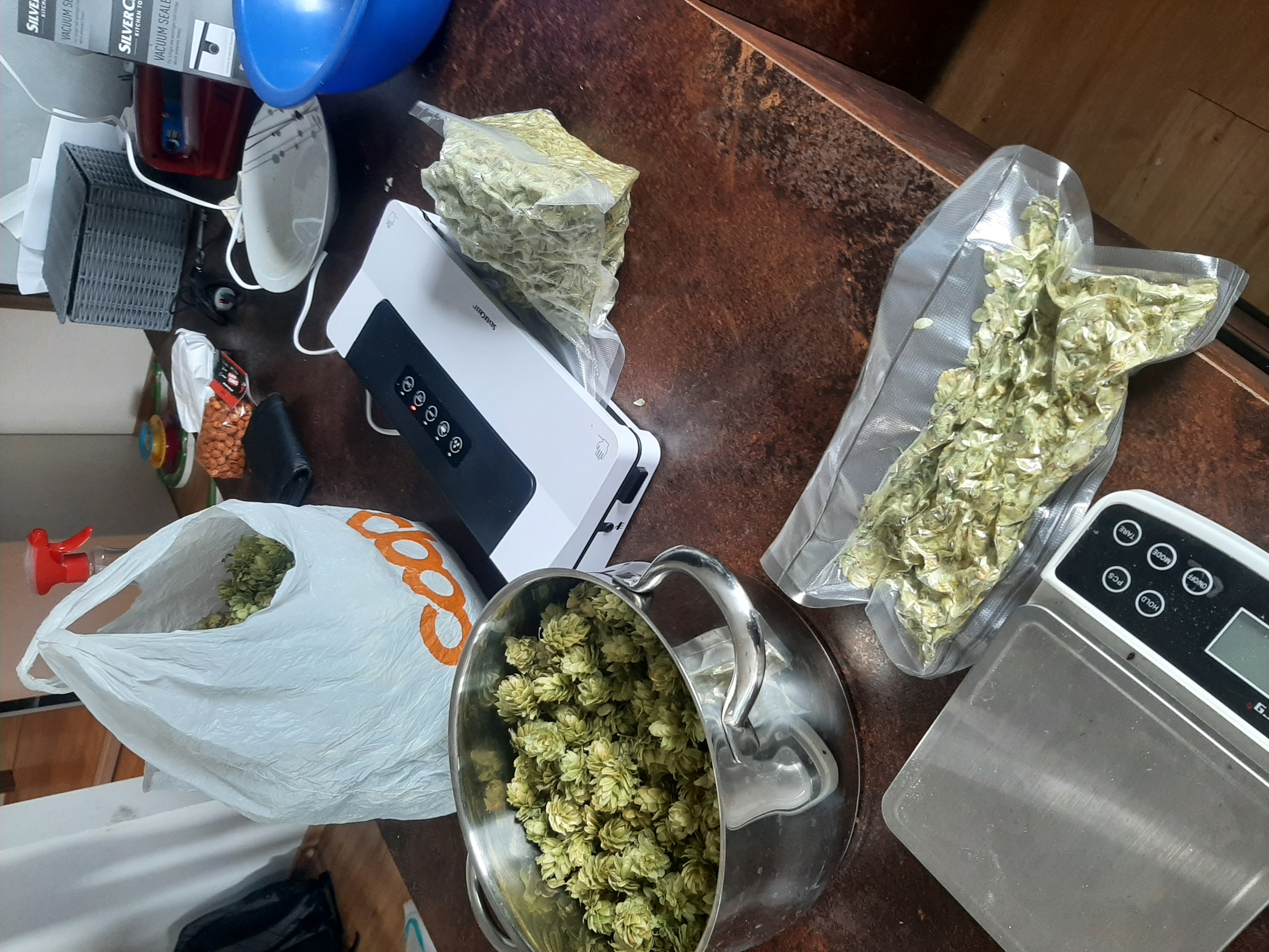První sklizeň chmele ze čtyř babyček vysazených v roce 2021 – odrůdy ŽPČ a Sládek, výsledné hmotnosti po sušení a praktické poznatky.