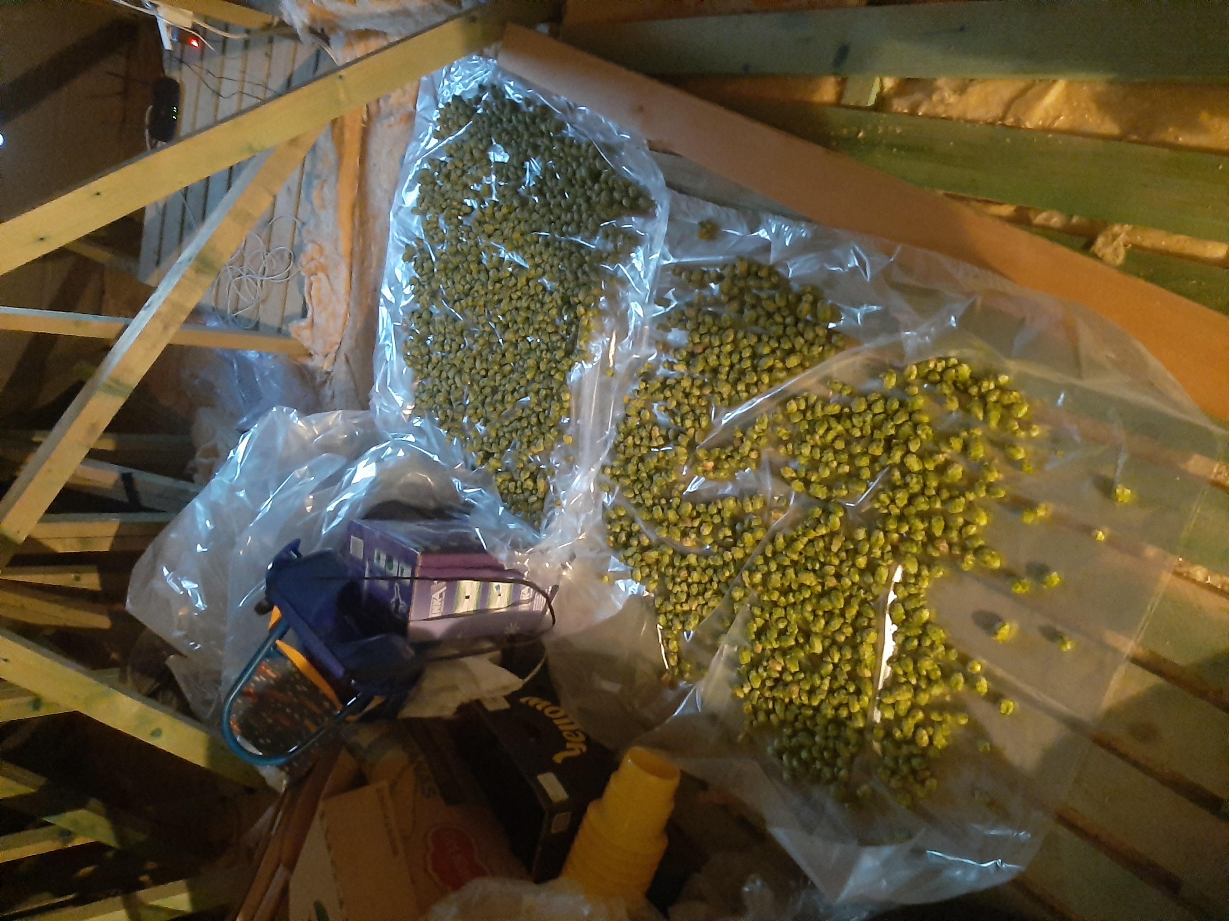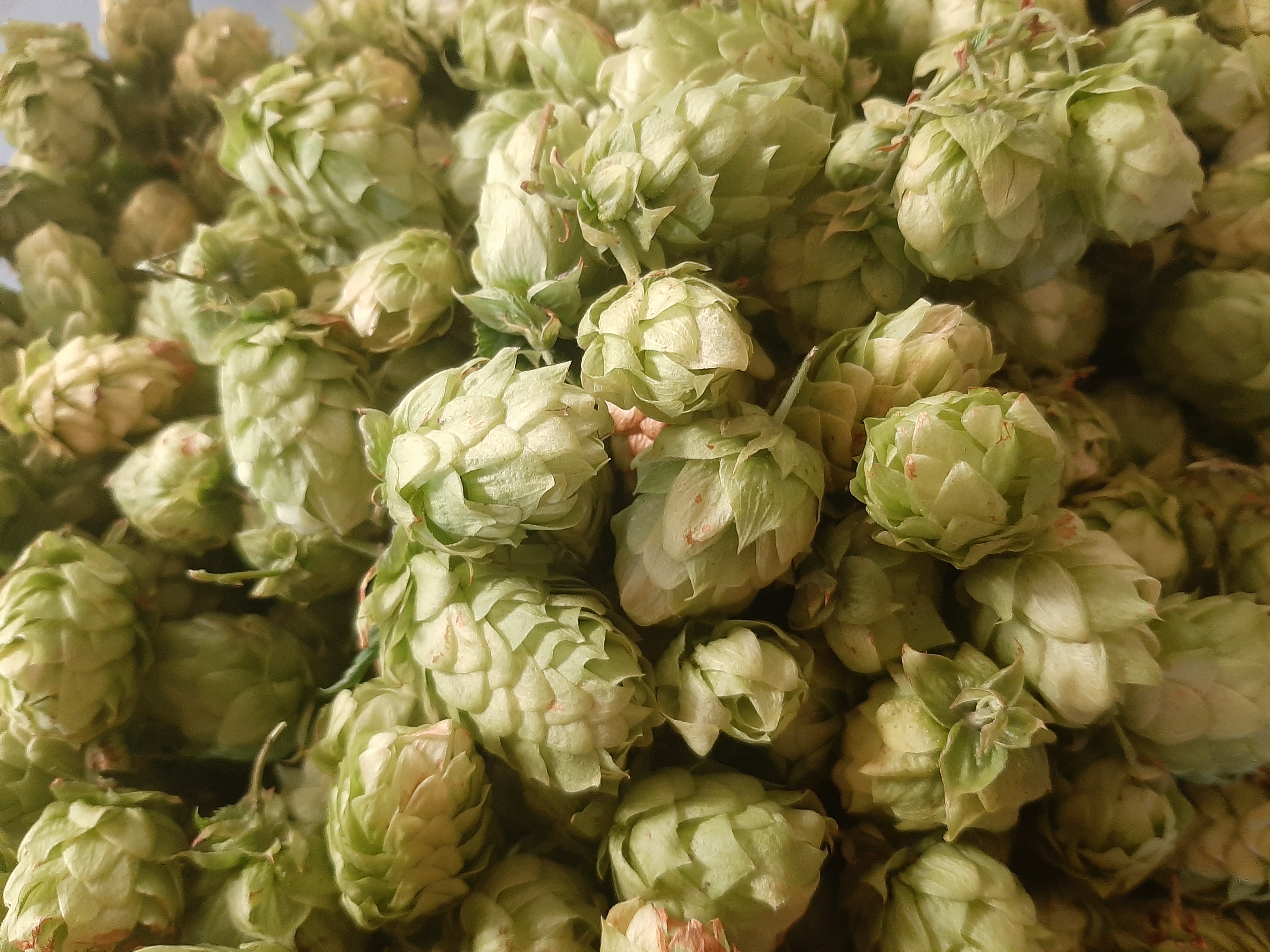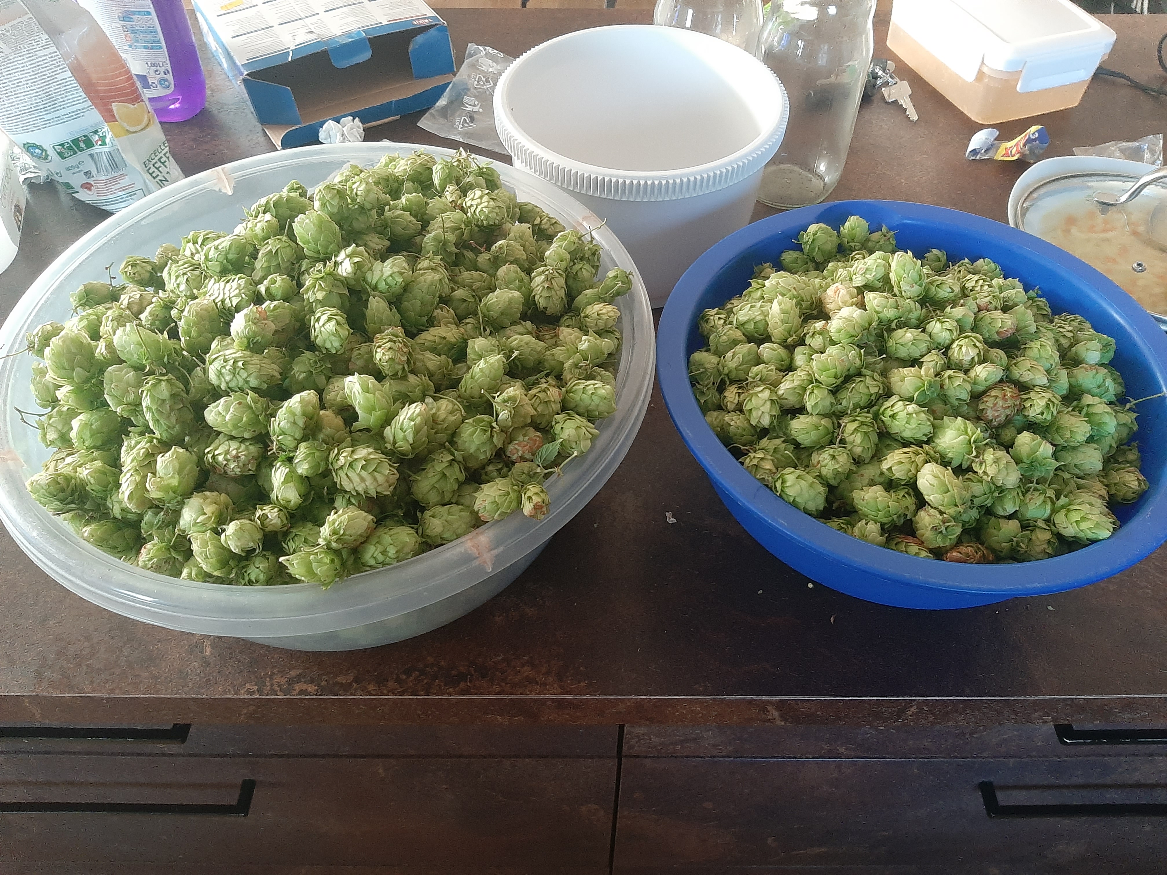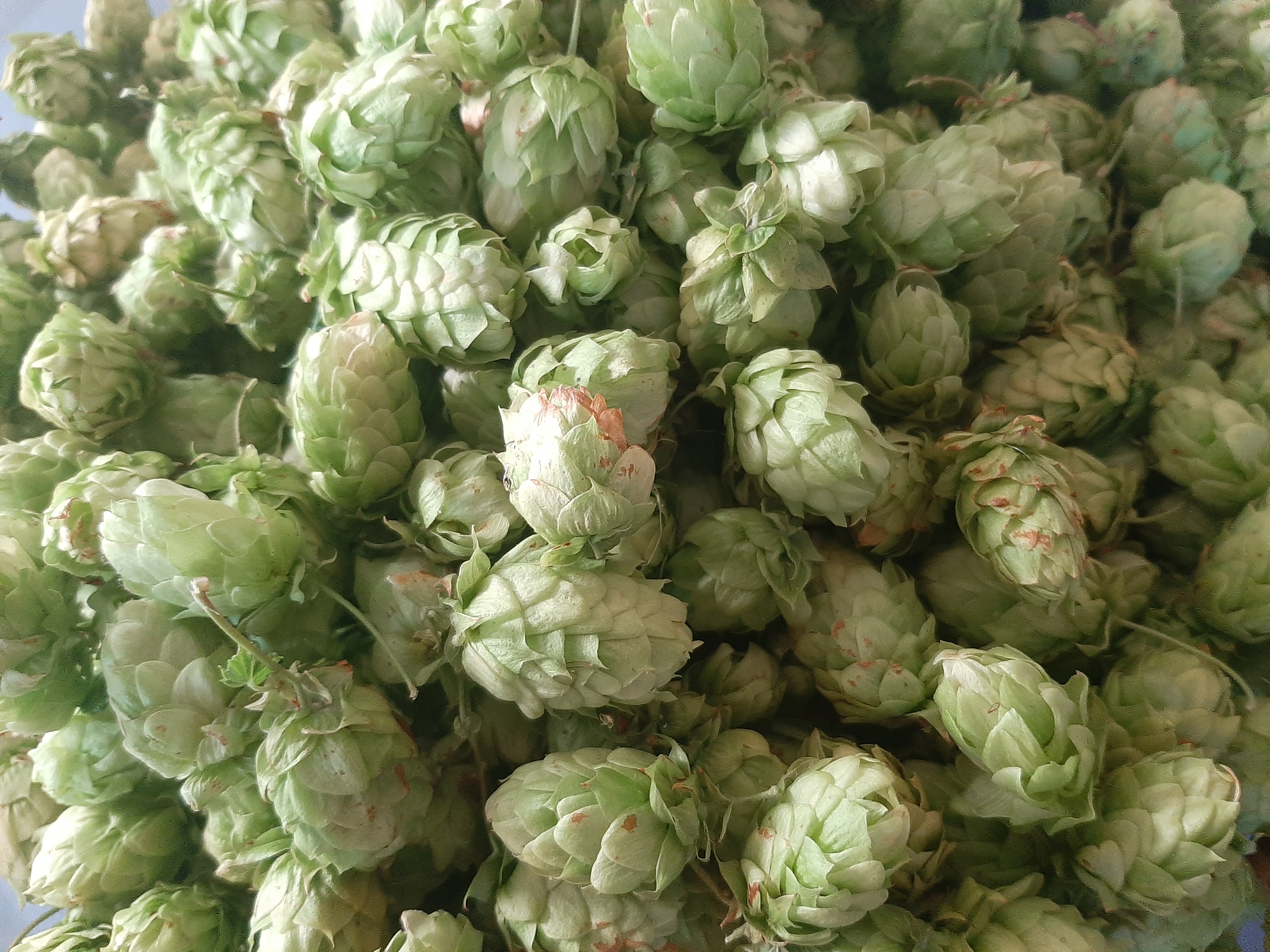 První sklizeň chmele ze čtyř babyček vysazených v roce 2021 – odrůdy ŽPČ a Sládek, výsledné hmotnosti po sušení a praktické poznatky.